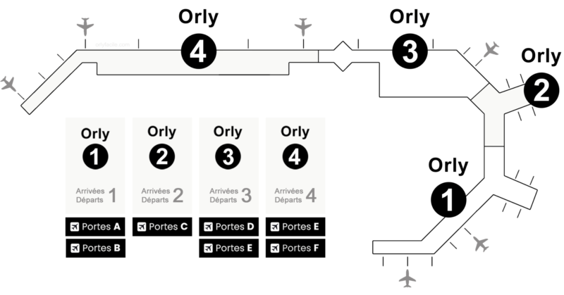 L’aéroport se compose de 4 terminaux appelés aussi secteurs : Orly 1 et 2 (ex Orly-Ouest), Orly 3, Orly 4 (ex Orly-Sud).