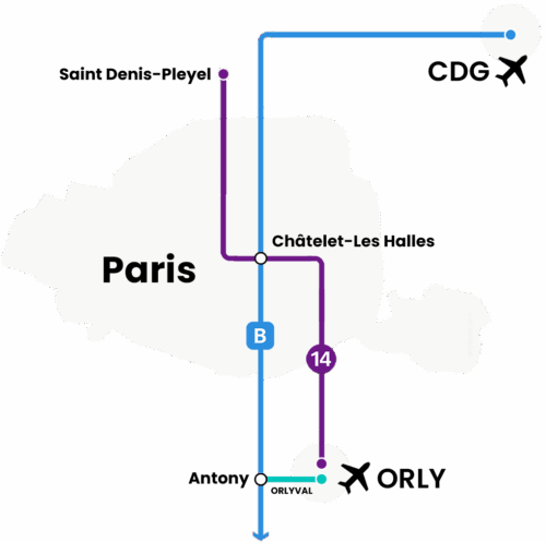 L’aéroport d’Orly est accessible via le RER B et la navette automatique Orlyval. Depuis le centre de Paris, le RER B relie des stations comme Gare du Nord, Châtelet–Les Halles ou Saint-Michel–Notre-Dame jusqu’à la gare d’Antony en 25 à 30 minutes. À Antony, la navette Orlyval assure la liaison avec les terminaux d’Orly en 8 minutes, avec des départs fréquents.