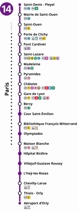 Metro Line 14 operates daily, including public holidays, from approximately 05:30 to midnight, with trains departing every 2–5 minutes. The average journey time between Orly Airport and Paris-Châtelet is around 25 minutes.