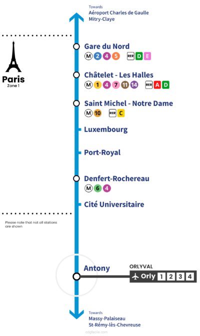 First stop in Central Paris is Cité Universitaire, other stations served are Denfert Rochereau, Port Royal, Luxembourg, Saint Michel-Notre Dame, Chatelet-Les Halles, and Gare du Nord.