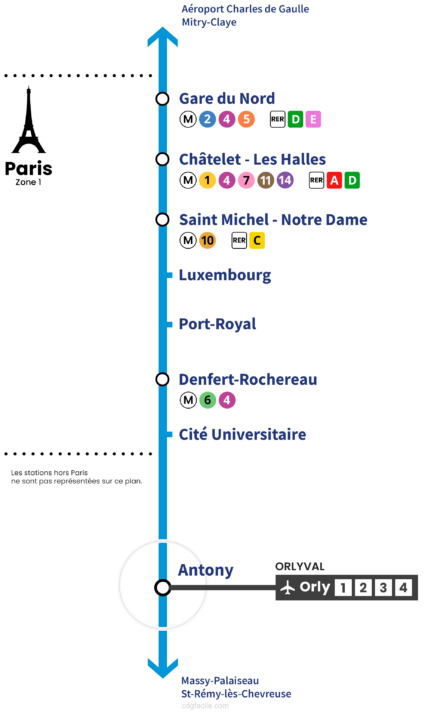 Prendre le RER B en direction de St Rémy-lès-Chevreuse ou Massy-Palaiseau jusqu’à Antony.